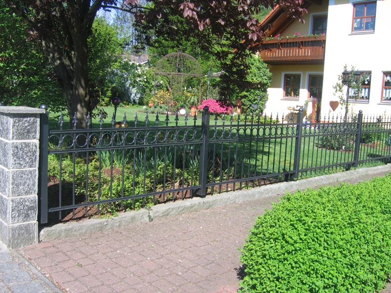 Die nach Maß geschmiedeten Metallzäune mit Bögen, Zierspitzen und Ornamenten grenzen an einen Holzzaun mit Betonpfosten. Die Farben werden mal an die Hausfassade angepasst, mal an das Umfeld.
